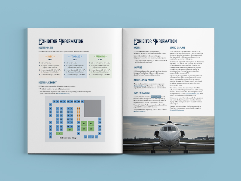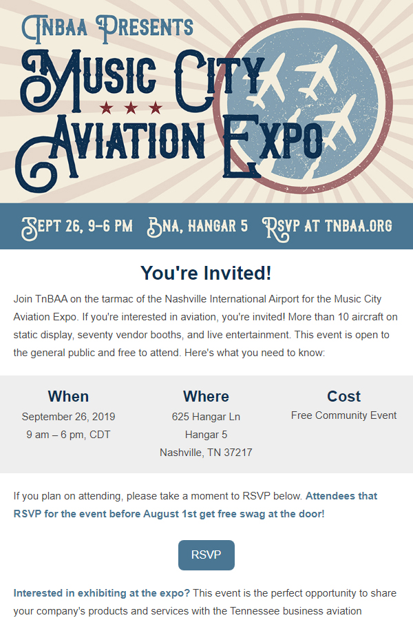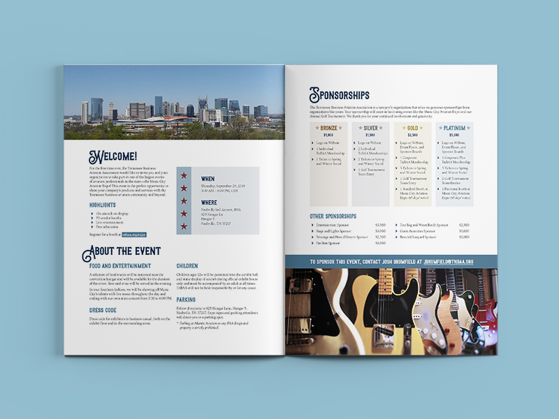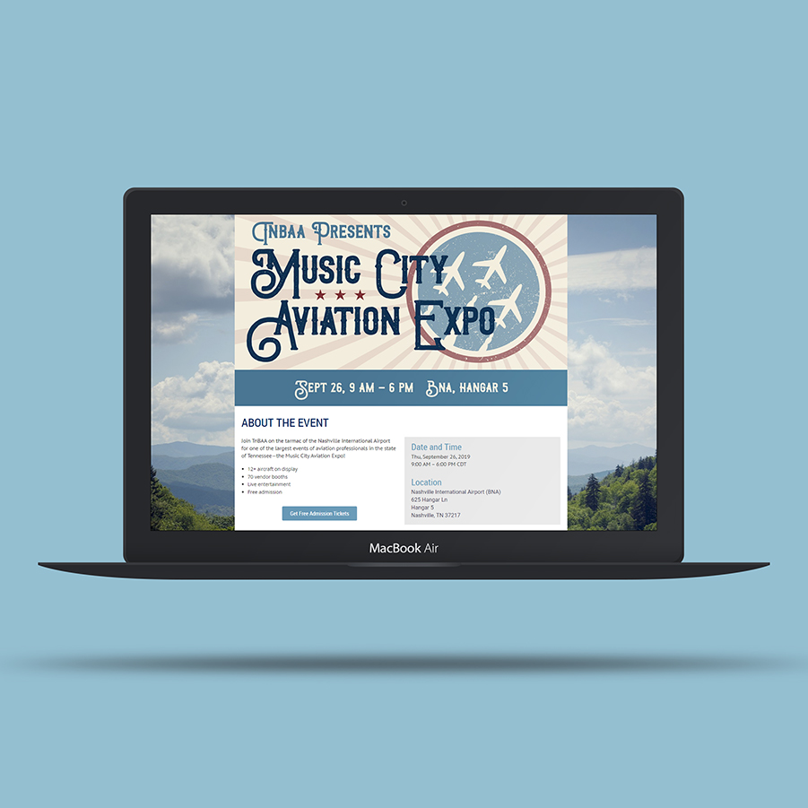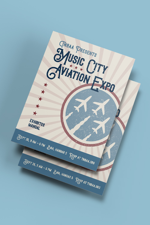 Last September, I worked with the Tennessee Business Aviation Association (TnBAA) to plan, brand, and market its first Music City Aviation Expo. The materials I created include marketing emails, social media posts, a manual, banners, t-shirts, badges, and more.