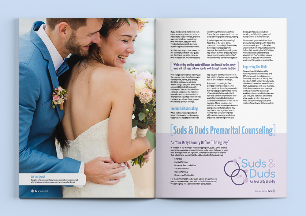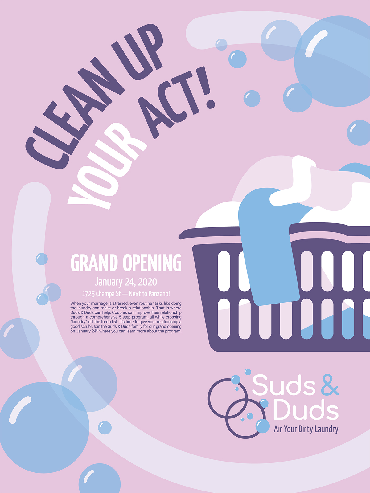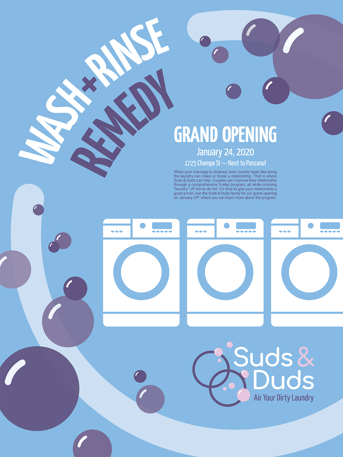 The theme for MTSU’s 2019 Senior Show was “businesses with a twist.” I created Suds & Duds, an all-in-one laundry and marriage counseling service.