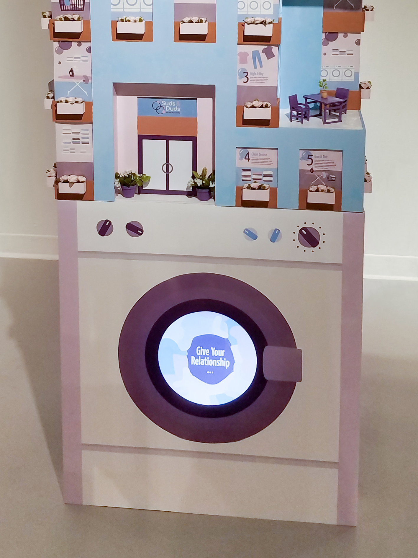 My exhibit was a stackable washer and dryer with a miniature of the Suds & Duds business in between. The drum to the washing machine was animated.